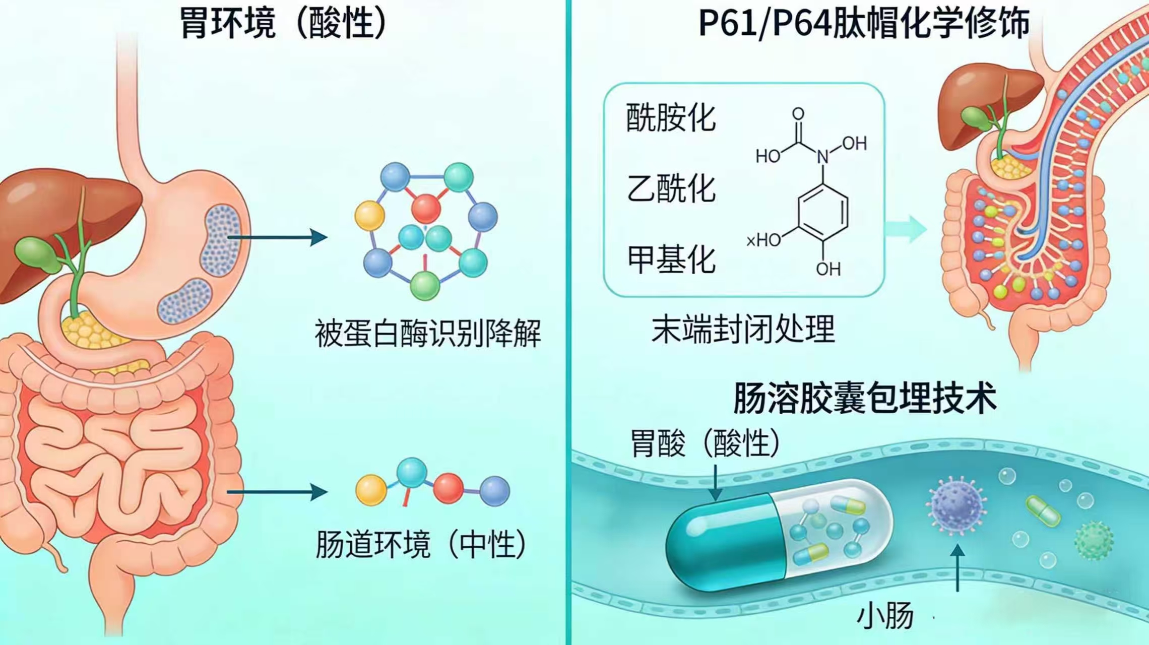 肽类物质在人体消化道内的生物稳定性较差,极易被胃、肠道中的蛋白酶降解,从而失去原有的生物活性,因此本研究将对 P61/P64 肽帽进行针对性的化学修饰和末端封闭处理。通过酰胺化、乙酰化、甲基化等成熟的化学修饰手段,改变肽帽的分子表面结构,保护其关键的肽键不被胃、肠道中的蛋白酶识别并分解,大幅提升肽帽在人体消化道内的生物稳定性。同时,本研究将采用肠溶胶囊包埋技术对优化后的肽帽进行包埋处理,利用肠溶材料的 pH 值敏感性,使包埋肽帽的胶囊在胃酸的酸性环境中保持结构稳定、不溶解,仅在小肠部位 —— 乳糜泻发病的核心病理区域,pH 值呈弱碱性的环境中精准释放肽帽活性成分,有效避免胃酸对肽帽的破坏,确保活性成分能够顺利抵达肠道的关键作用位点。