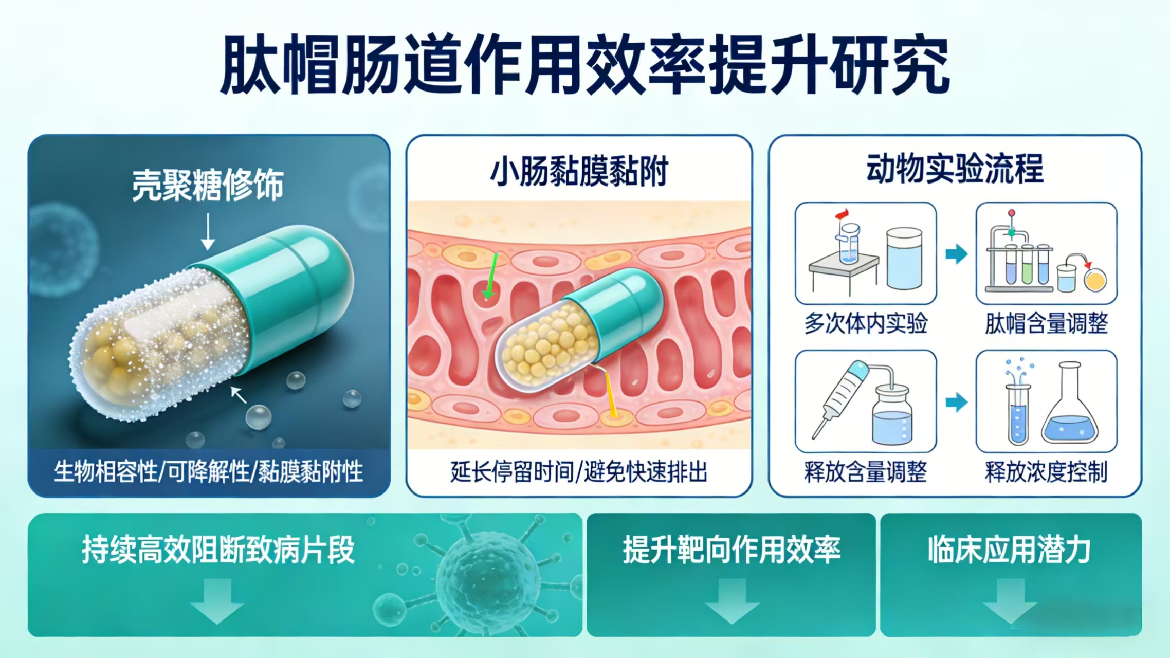 为进一步提升肽帽在肠道内的作用效率和持续时间,本研究将在肠溶胶囊的表面进行壳聚糖修饰处理。壳聚糖是一种具有良好生物相容性、生物可降解性和黏膜黏附性的天然多糖,经壳聚糖修饰后的肠溶胶囊能够紧密黏附于小肠黏膜表面,有效延长肽帽在小肠内的停留时间,避免其随肠道的正常蠕动快速排出体外。同时,本研究将通过多次体内动物实验,反复摸索并精准调整胶囊内肽帽的有效含量,实现对肽帽在小肠内释放浓度的精准控制,保证肠道内始终维持能够有效阻断致病片段的肽帽浓度,实现对残留致病片段的持续、高效阻断,大幅提升肽帽的靶向作用效率和临床应用潜力。