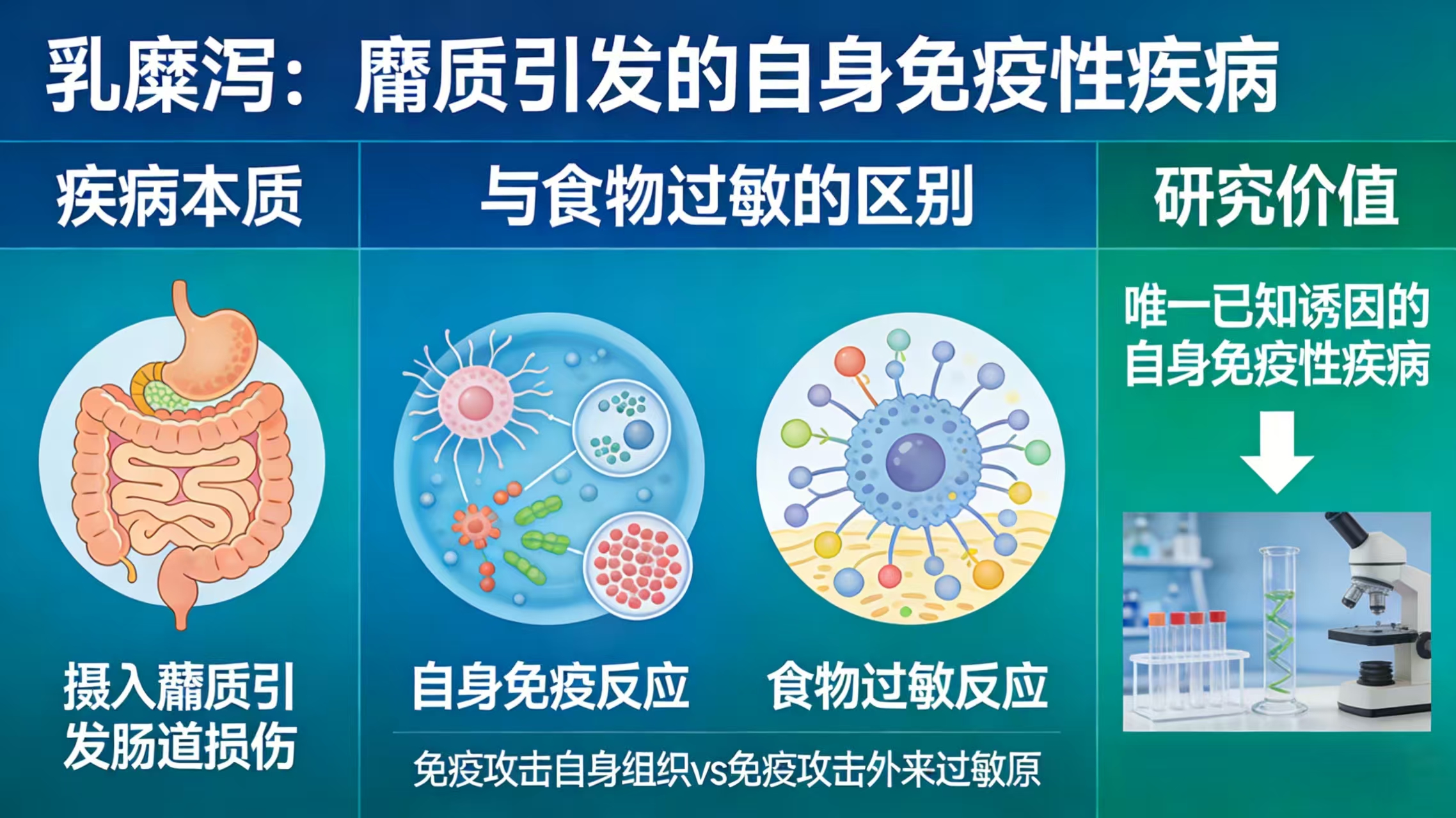 乳糜泻是一种由摄入麸质引发的肠道疾病,且属于自身免疫性疾病(会损害身体自身组织),并非食物过敏,其对麸质的免疫反应与食物过敏机制不同,同时它也是唯一已知诱因的自身免疫性疾病,这一特征为疾病的靶向干预研究提供了关键的切入点。
