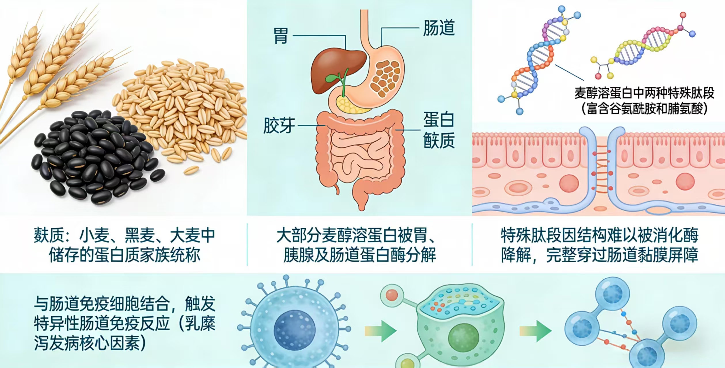 麸质是存在于小麦、黑麦、大麦中储存的蛋白质家族统称,麸质中的麦醇溶蛋白(Gliadin)是主要致病组分,但大部分麦醇溶蛋白会被胃、胰腺及肠道蛋白酶分解;麦醇溶蛋白中存在两种特殊的肽段,因分子结构中高度富含谷氨酰胺和脯氨酸,这类氨基酸的特殊结构使其难以被人体常规的消化酶识别并降解,两种肽段因富含谷氨酰胺和脯氨酸,这类氨基酸的特殊结构使其难以被人体常规的消化酶识别并降解,能够完整穿过肠道黏膜屏障进入体内循环,最终与肠道免疫细胞结合,触发特异性的肠道免疫反应,成为乳糜泻发病的核心关键因素。